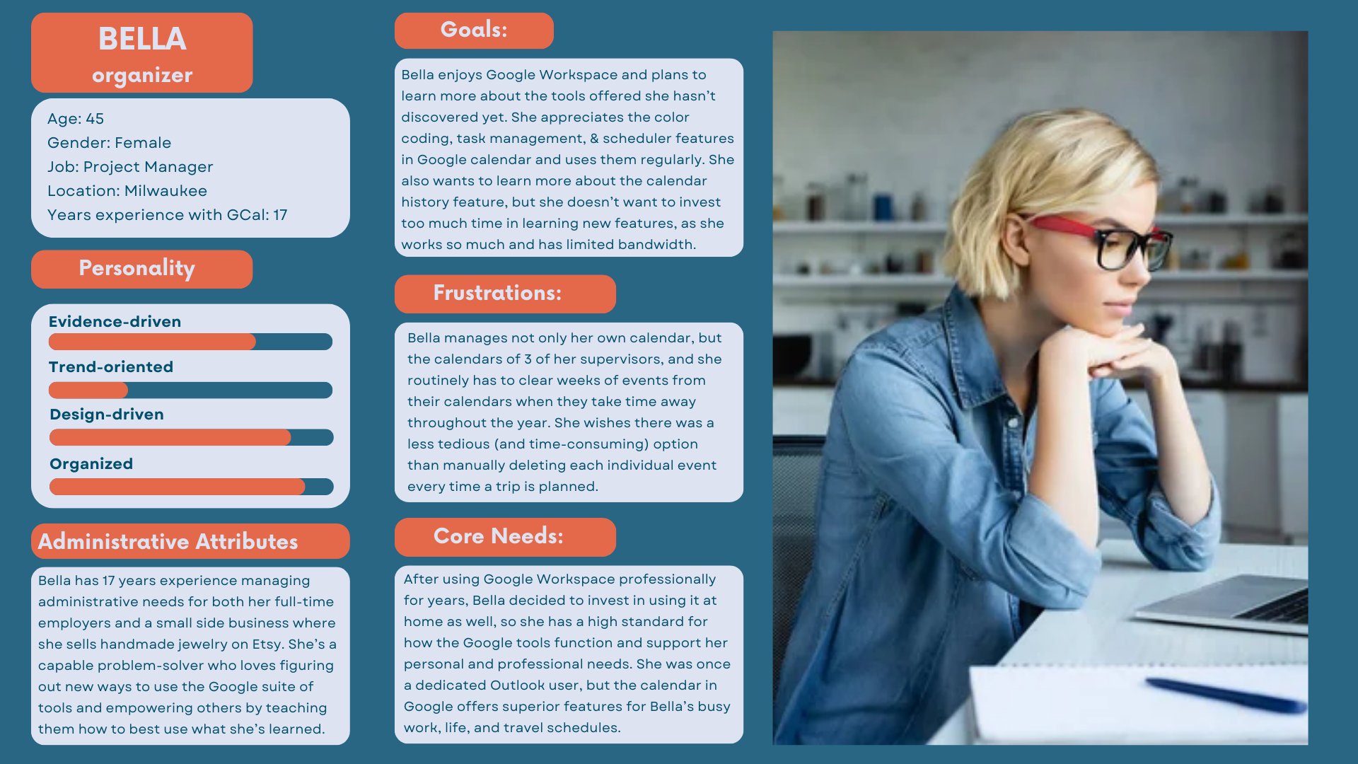 Through user interviews I developed a primary persona to represent our key demographic, which I call “The Organizer”: