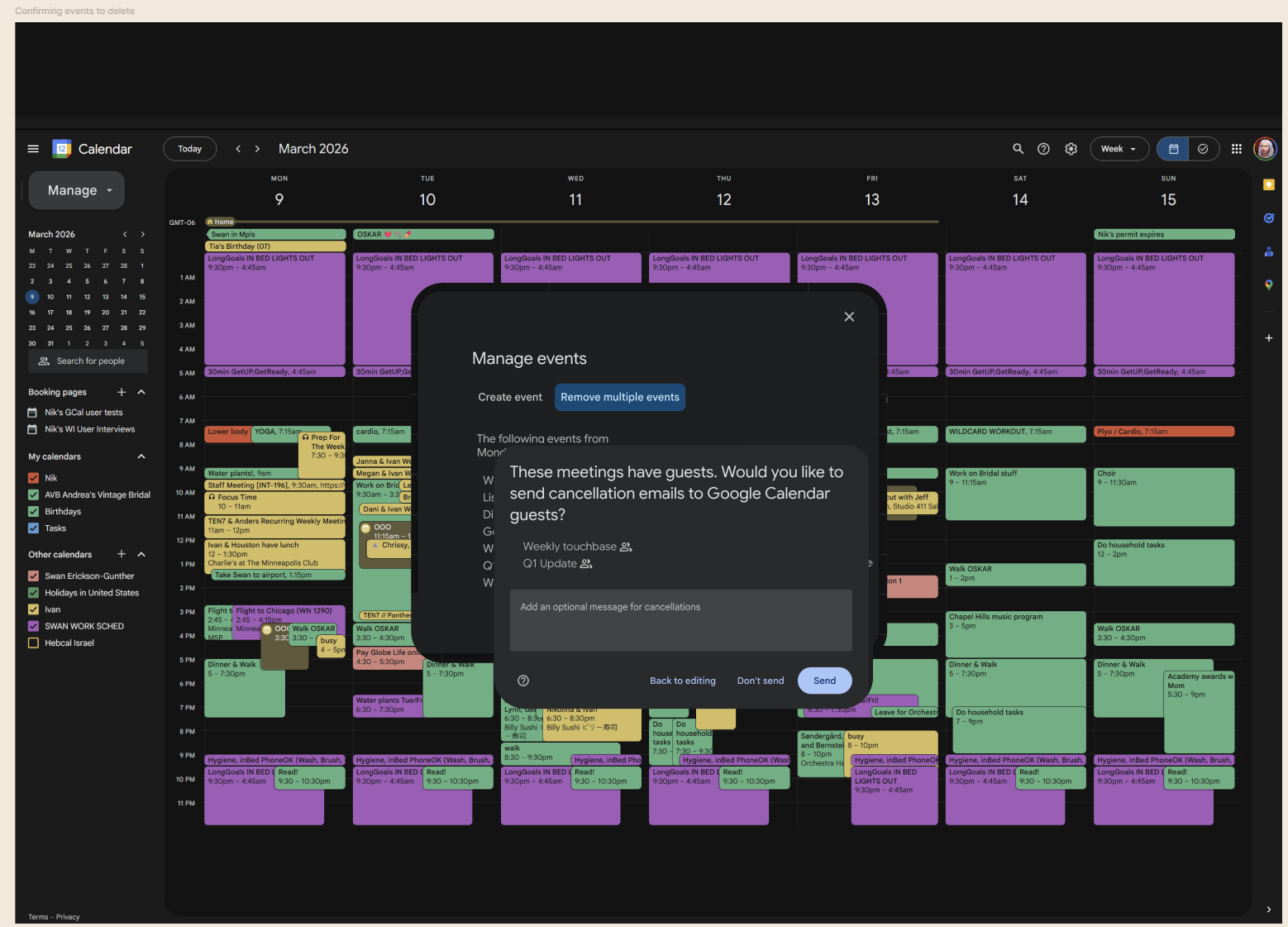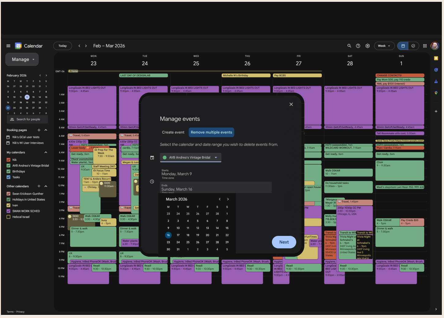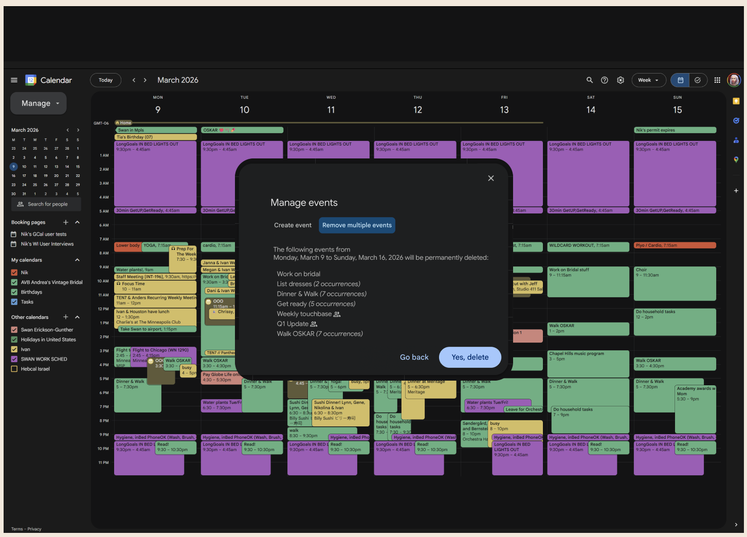 Lack of Mass Event Management: The calendar lacks a function to mass delete multiple, one-off events within a specified timeframe (e.g., clearing a week for vacation), requiring users to delete each entry individually.