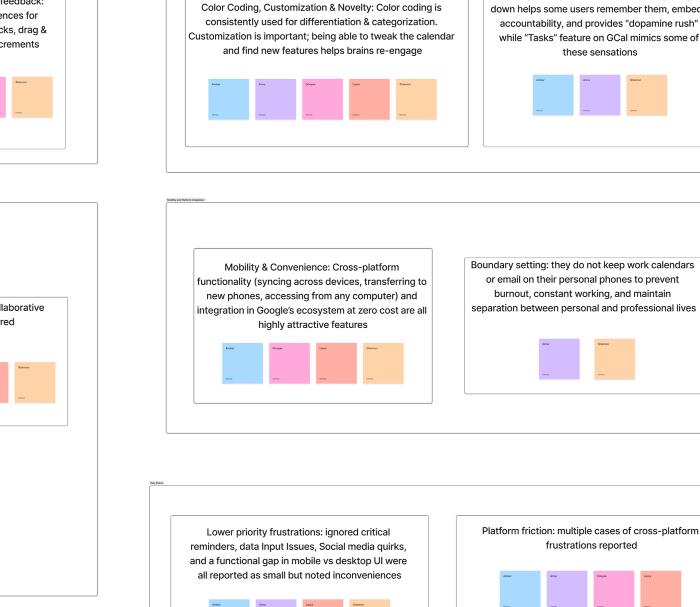 ● A significant finding is that three out of five interviewees identify as neurodivergent with ADHD. This heavily influences their calendar use, often leading to a need for external organization, visual cues, and specific features to manage focus, memory, and task completion.