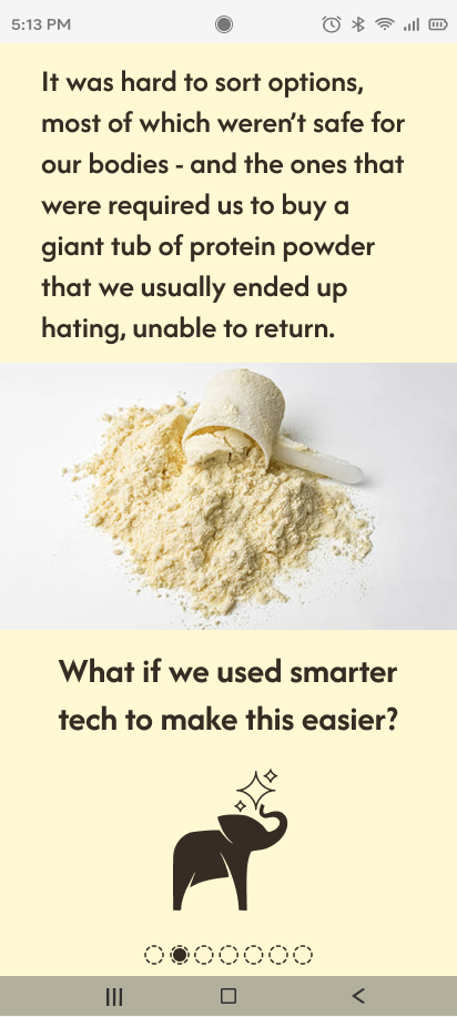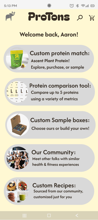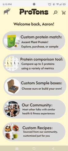 Homepage Confusion: Returning user layout was preferred. New user page feedback was split: some liked the abundant communication, while others wanted more tangible, graphic-supported examples of functions. The intro screen was retained as common for all users; the more abundant onboarding was chosen for new users. Returning users are quickly shown their custom protein match.